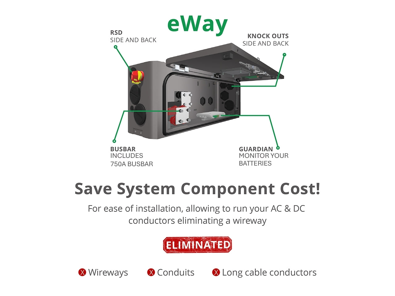 The eForce Battery features the innovative eWay hub that integrates busbars, conduit ports, and an emergency shutoff. Paired with the Envy 12kW Inverter’s built-in AC/DC breakers, this bundle reduces extra components, wiring time, and total system cost.