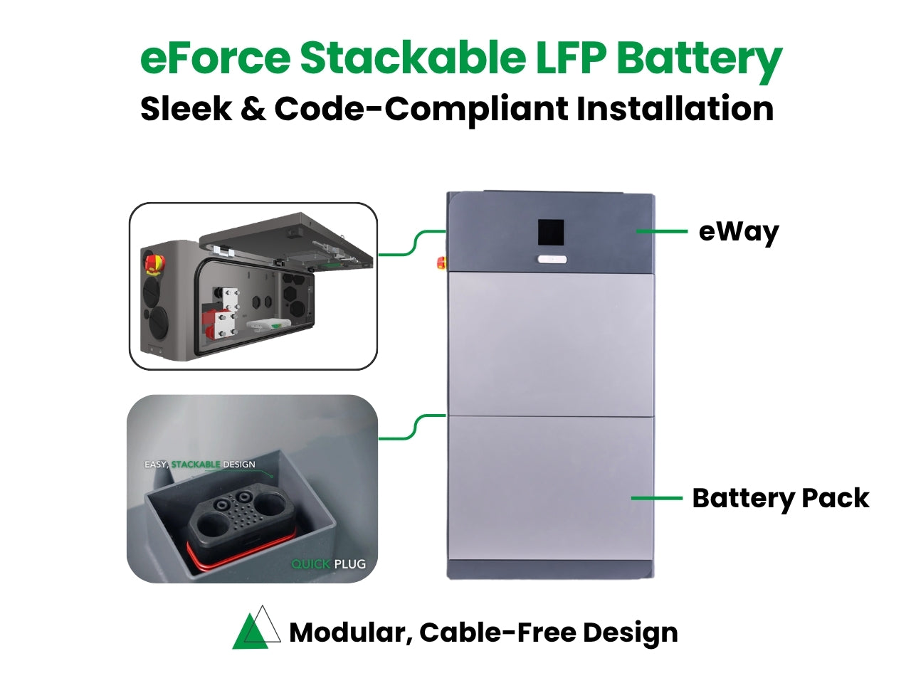 The eForce batteries feature over 8,000 cycles and a 20-year design life, with a modular stackable design and built-in eWay wireway for a safe, organized, professional installation.