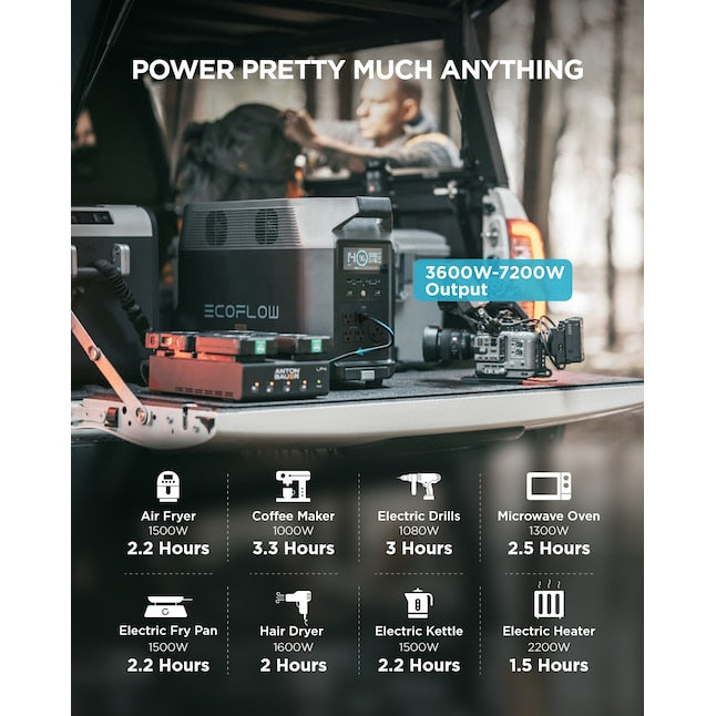 The EcoFlow DELTA Pro is a powerful, portable energy solution designed for home backup, RV adventures, and off-grid lifestyles. With a 3.6 kWh base capacity and 3,600 W continuous AC output, it can power home appliances, most portable tools, and medical devices reliably.