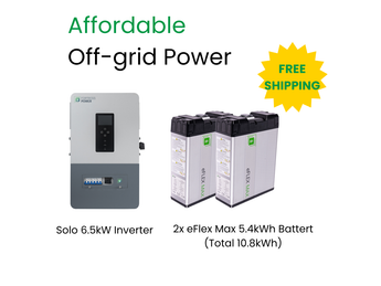 Get started with off-grid energy at a cost-effective level. This bundle includes the reliable Solo 6.5kW off-grid inverter paired with two eFlex MAX 5.4kWh lithium batteries (total 10.8kWh) to form a compact, efficient solar + storage setup.