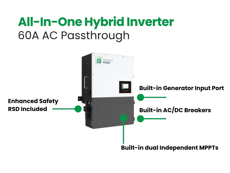 The Fortress Power Envy 8/10kW Hybrid Inverter is a all-in-one solution for whole-home solar energy storage, backup power, and off-grid systems. Delivering up to 8kW (33.3A @ 240V) or 10kW (41.6A @ 240V) of continuous output through a 60A AC passthrough, it ensures your home or small business stays powered reliably.